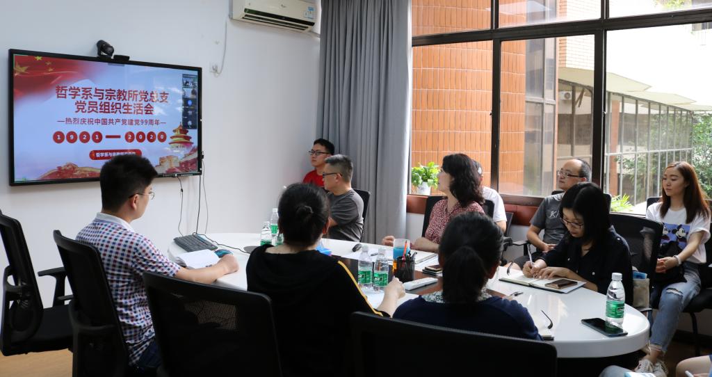 2020年7月10日下午15:00,“不忘初心,再启征程——热烈庆祝中国共产党建党99周年”哲学系与宗教所党总支微党课暨党员组织生活会在文科楼205会议室顺利举行,现场参会党员16名、其余党员通过腾讯会议云端参会,会议由李裴副书记主持。