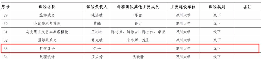 2020年12月22日,四川省教育厅发布《关于公布首批省级线下、线上线下混合式、社会实践一流本科课程认定结果的通知》(川教函【2020】620号),我系余平教授负责的《哲学导论》被评为省级线下一流本科课程。