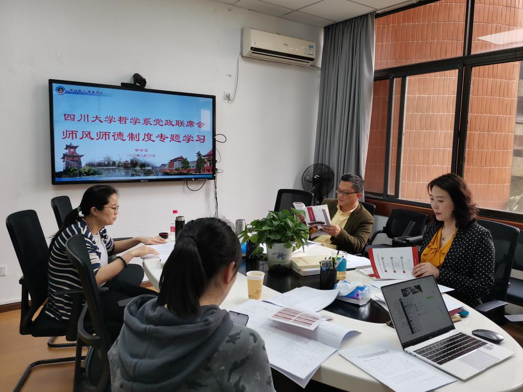 4月28日下午,哲学系与宗教所党总支理论学习中心组在文科楼205开展师风师德专题学习,会议由史冰川书记主持。