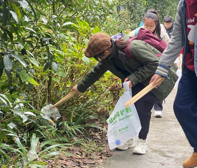 行入深林,团队成员无不被感染于丰涌磅礴的生命魅力之中,无论是耸入云处的巨木,亦或是道边的花枝草木,每次呼吸之间的清爽,都是人与自然生命协谐共处的体悟。也正因如此,散落林间的人造垃圾便显得更加“触目惊心”,团队成员们纷纷用手中的工具将其收捡拾装,还自然以本色。