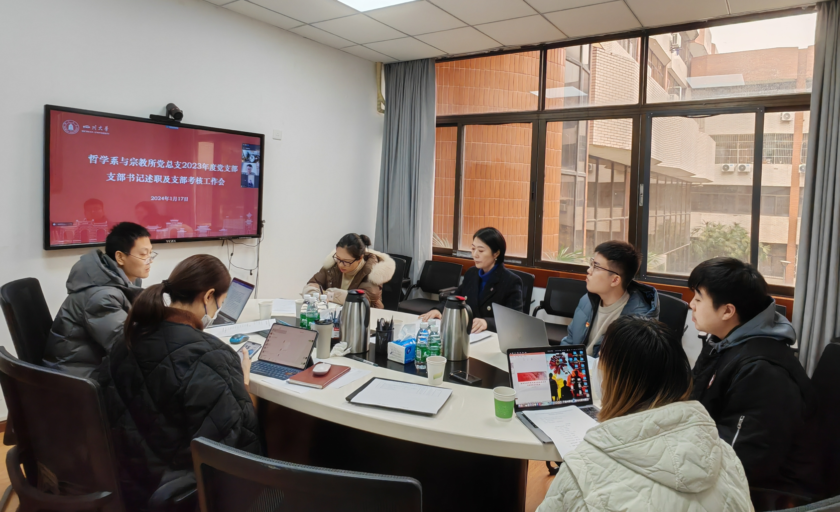 2024年1月17日下午,哲学系与宗教所党总支2023年度党支部书记述职评议考核和党支部工作考核会议,在文科楼205会议室举行,党总支委员、各支部书记参加会议,会议由党总支史冰川书记主持。
