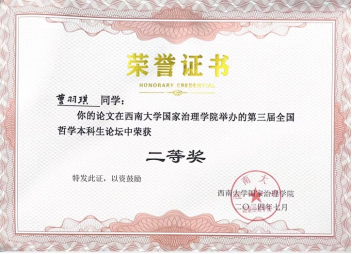 2024年7月6日至7月7日,哲学系2021级强基计划本科生曹羽琪赴重庆参加第三届全国哲学专业本科生论坛,提交的参会论文《苏贾第三空间理论对二元论的突破与问题》获论坛二等奖。