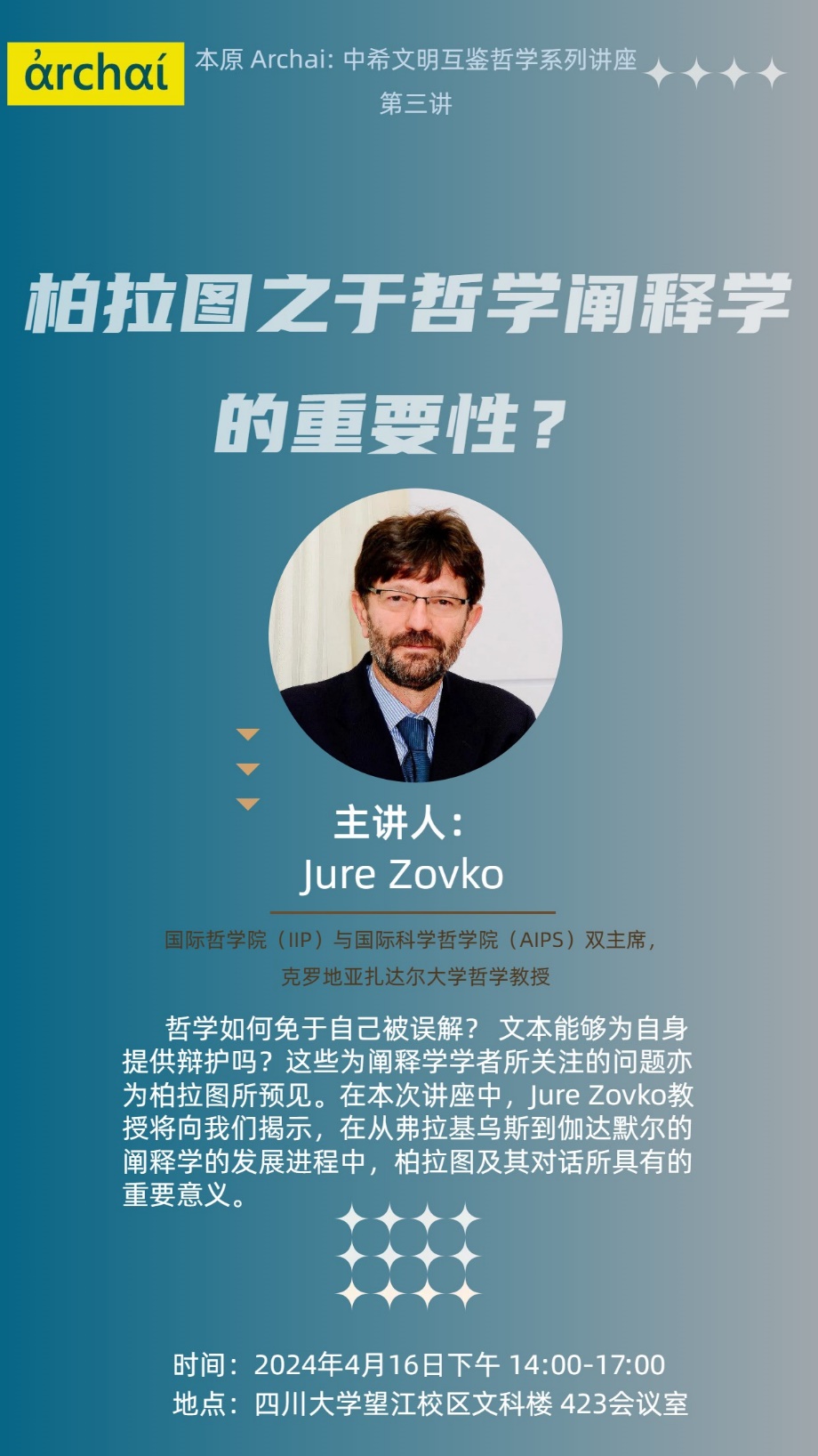 主讲人简介:Jure Zovko,国际哲学院(IIP)与国际科学哲学院(AIPS)双主席,克罗地亚扎达尔大学哲学教授。他的研究领域包括:阐释学、古希腊哲学、德国观念论,以及科学哲学。