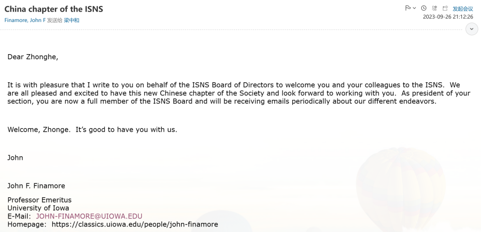 (国际新柏拉图主义协会执委会主席John Finamore教授来信通知中国分会成立和梁中和教授当选的邮件原文)