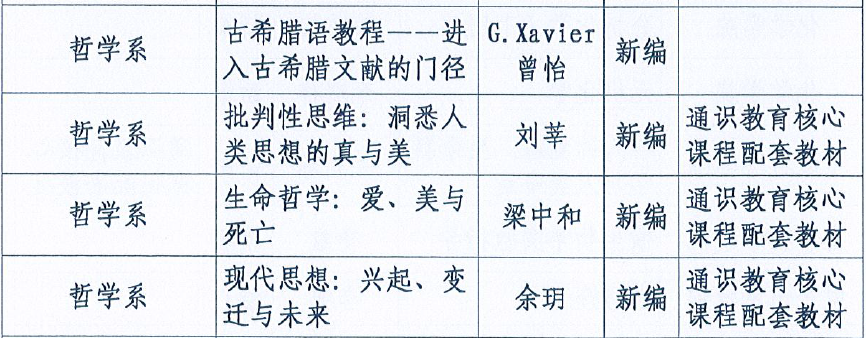 根据学校《关于印发<365英国上市集团教材管理实施细则>的通知》(川大教[2020]32号)文件精神,为进一步推动我校高水平教材建设,学校启动了2020年365英国上市集团立项教材建设申报评审工作。我系教师发挥优势,合理布局跑道,自主整合教研力量形成团队进行申报,经系上推荐、学校专家评审,申报团队全部获批立项!共4项获批立项(1门专业课教材、3门通识教育核心课程教材),分别是:G.Xavier和曾怡主编的《古希腊语教程——进入古希腊文献的门径》、刘莘主编的《批判性思维:洞悉人类思想的真与美》、梁中和主编的《生命哲学:爱、美与死亡》、余玥主编的《现代思想:兴起、变迁与未来》。