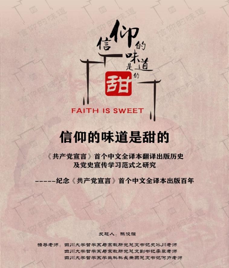“信仰的味道是甜的:纪念《共产党宣言》出版百年与献礼建党百年”是由哲学系拔尖计划陈俊强同学带领开展的项目。2021年适逢中国共产党百年诞辰和“两个一百年”历史交汇的关键节点,同时正值《共产党宣言》中文首译本出版101年、陈望道诞辰130年,面对这一重要的历史契机,团队成员前往陈望道故居、上海市中共有关遗址等地开展红色专项实践活动,得到了义乌中学校长吴彩军、望道中学校长周艳兰和我系熊林主任的推荐,最终以“调查报告+正能量宣传短视频”的形式,展现信仰的魅力,发扬望道精神。团队成员还将实践活动中的体会感悟融合到歌曲之中,用《甘》这一首歌曲串联过往的峥嵘岁月和新时代青年信仰的甘甜滋味。