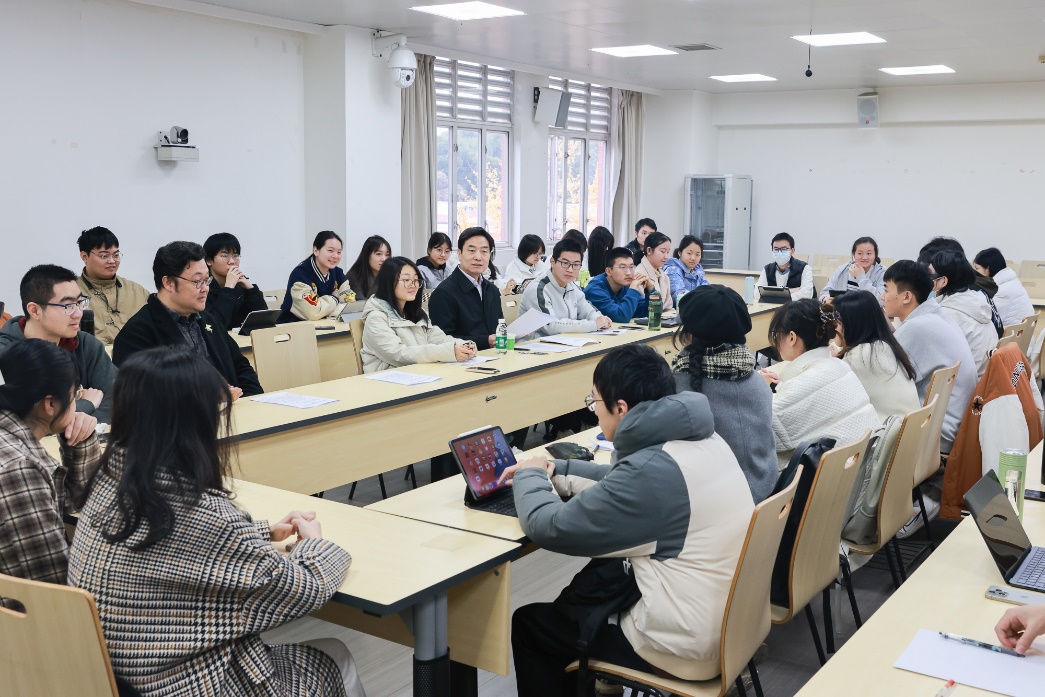12月13日,校党委书记甘霖走进哲学系2021级本科班开展名誉班主任交流活动,关心了解同学们的学习生活情况,鼓励同学们德智体美劳全面发展。