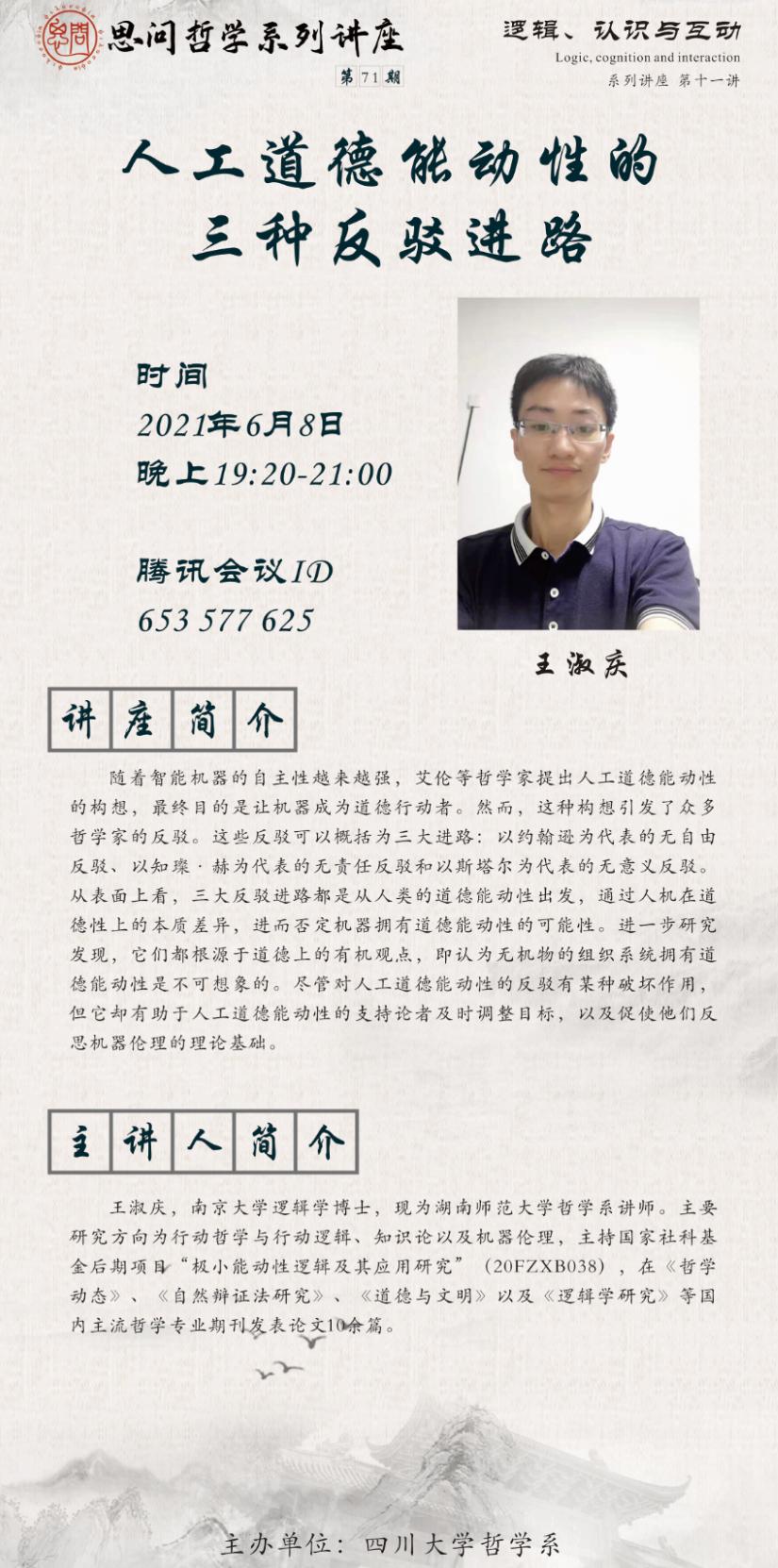 王淑庆,南京大学逻辑学博士,现为湖南师范大学哲学系讲师。主要研究方向为行动哲学与行动逻辑、知识论以及机器伦理,主持国家社科基金后期项目“极小能动性逻辑及其应用研究”(20FZXB038),在《哲学动态》、《自然辩证法研究》、《道德与文明》以及《逻辑学研究》等国内主流哲学专业期刊发表论文10余篇。
