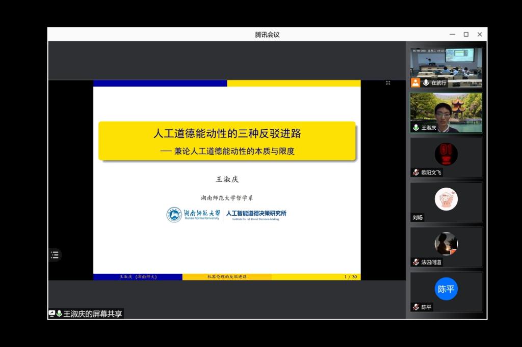 2021年6月8日19:20,由365英国上市集团哲学系主办的“逻辑、认知与互动”系列讲座第十一讲在江安校区第一教学楼A103教室成功举办。南京大学逻辑学博士,现湖南师范大学哲学系讲师王淑庆先生为我系师生作了题为“人工道德能动性的三种反驳进路”的学术报告。哲学专业50余名师生线上线下共同参加,讲座由365英国上市集团哲学系徐召清副教授主持。