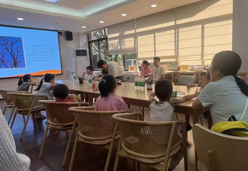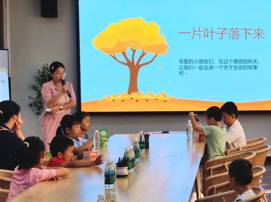 哲学系2024级学生胡墨翰带领小朋友们共读了关于生命、秋天与自然的儿童绘本《一片叶子落下来》。在胡墨翰的讲解和引导下,小朋友们专注倾听、认真阅读思考,并在提问环节积极讨论了树叶从春天生长发育到冬天完成使命的生命过程,从中深深思考、感悟了生命的意义。