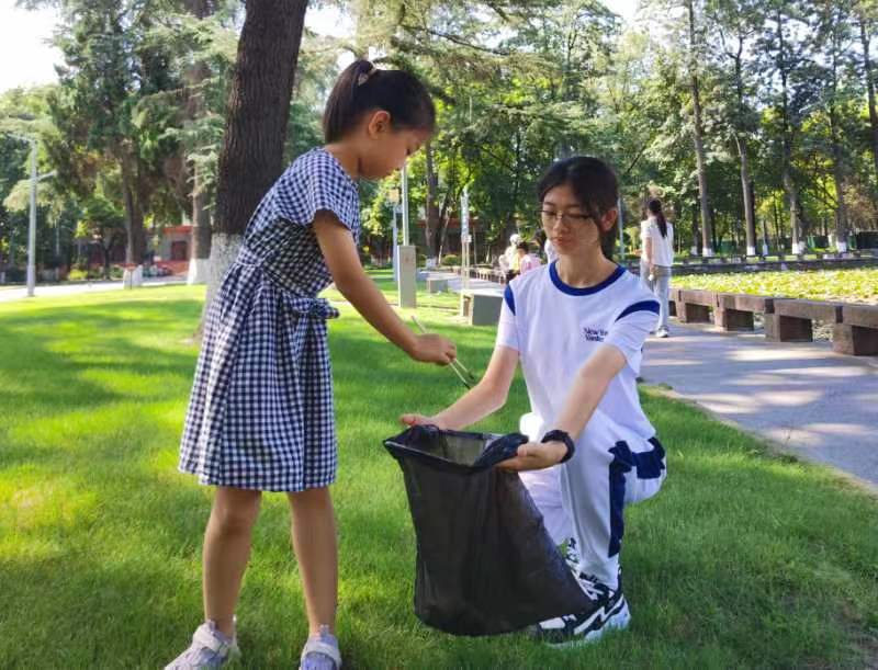 活动最后,小朋友和志愿者们在荷花池前的草坪上共同捡拾垃圾、守护草坪卫生环境,大家在劳动过程中收获了奉献感与自豪感。