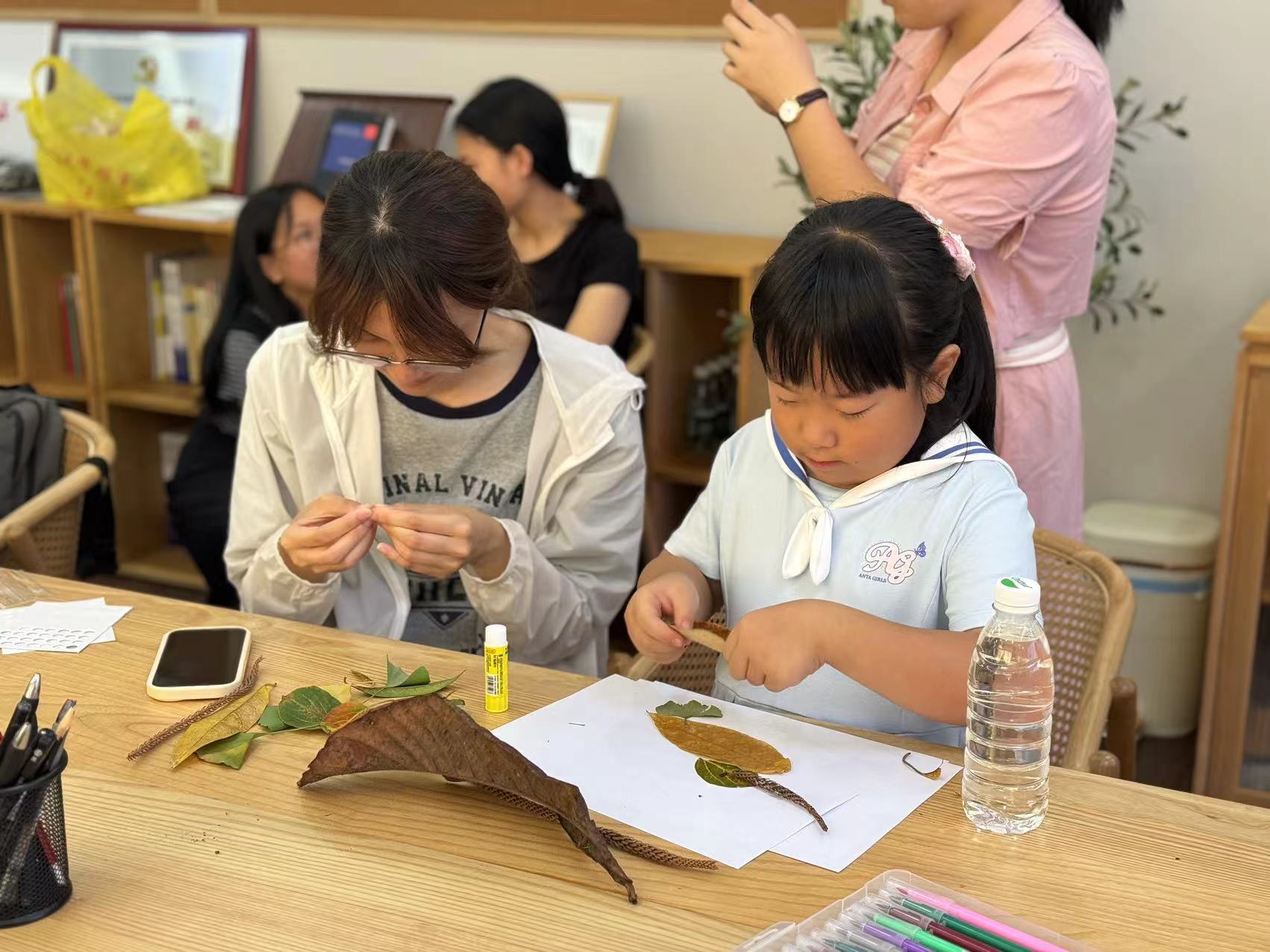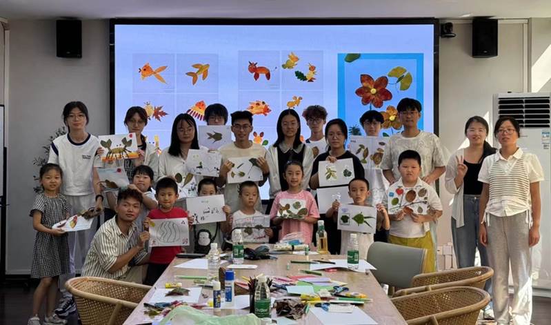绘本共读圆满结束后,小朋友们在家长、志愿者们的陪伴下去户外收集落叶、落花等并进行创意图画拼贴、折纸、绘画等活动。在这一环节中,小朋友们与志愿者友好协作、发挥创意,自由积极地运用多种方式表达自己的见闻与感悟。