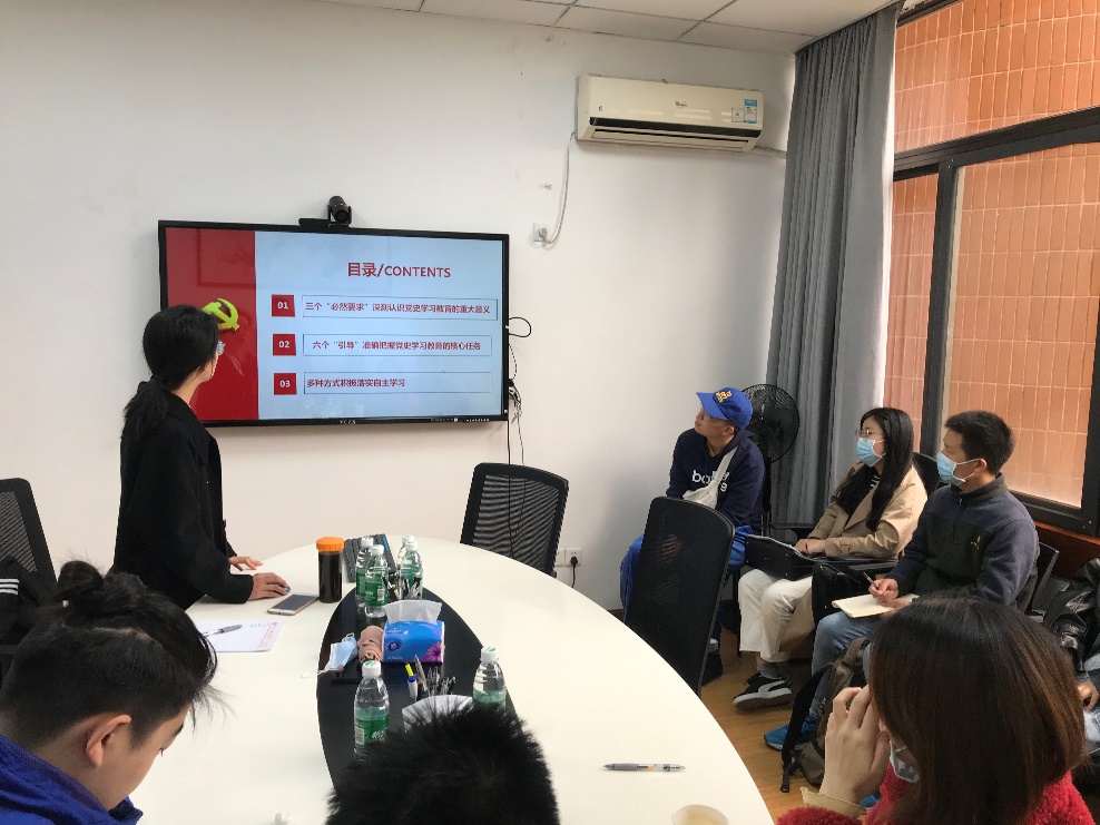 首先,冷先立同志介绍了党史学习教育的提出背景和学习目标,其中,学史明理是增信、崇德、力行的基础,要把握好学习内容。紧接着,围绕三个“必然要求”阐述开展党史学习教育的重大意义,并指出“一百周年”也就意味着有所可学,即积累了一定的经验和教训,可于此反思借鉴、继往开来。再从六个“教育引导”阐明党史学习教育的重点,尤其强调“从党的非凡历程中领会马克思主义是如何深刻改变中国、改变世界”这一点,可以发挥支部党员的专业所长,从原著中、历史上,来切实体会。最后,以学习强国的相关版块和党史学习教育官网为例,推荐各位党员采取适合的方式积极落实自主学习。