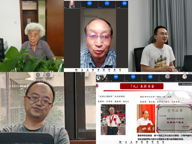 第二阶段,由党员师生代表作专题发言。首先,由离退休党支部新发展为预备党员的87岁刘慧群同志发言,她重点讲述了孜孜以求、不忘初心追寻入党的心路历程和作为新发展党员在今后理论学习、生活和持续发光发热方面的意愿。针对刘慧群同志的发言,离退休党支部支部书记陈建明同志作了情况介绍和表示祝福,线上线下多名党员同志围绕刘慧群同志的发言表达了祝福,均表示深受感动和启发。随后,学生支部新发展党员亓尹、陈芹先后结合习近平总书记“七一”重要讲话精神的学习、入党的经历和学习成长经历,谈了入党感言和学习体会。