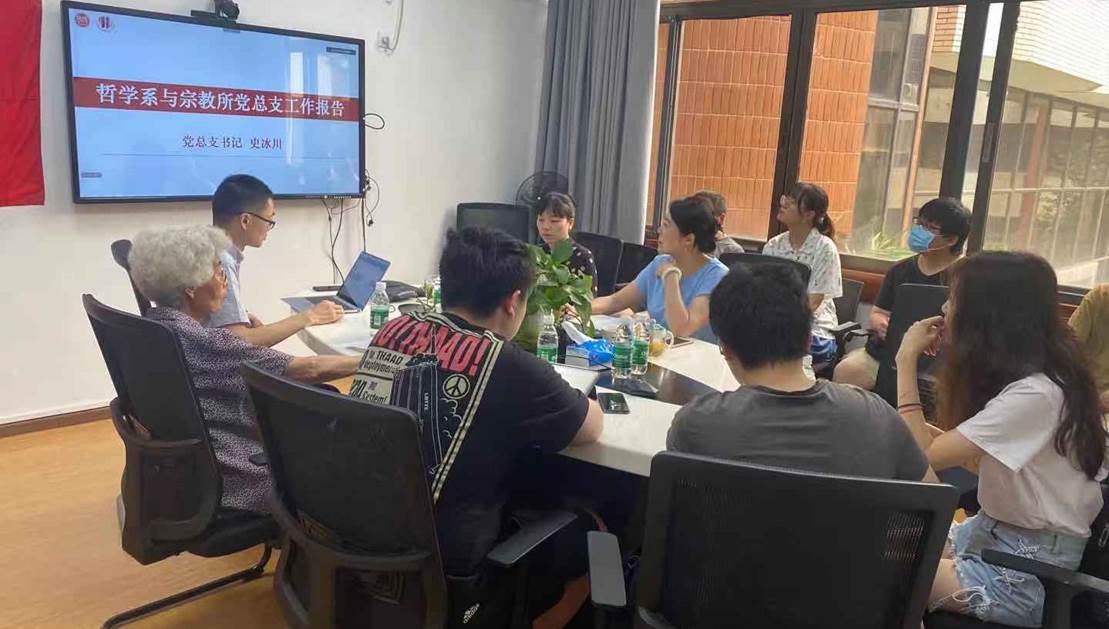 7月7日下午15:00,为庆祝建党100周年,总结2021年春季学期党总支党建工作、部署和安排习近平总书记“七一”重要讲话精神的学习等,哲学系与宗教所党总支全体党员大会通过线上线下结合方式开展,党总支委员、党支部书记、党员师生代表在文科楼205参加,其余党员同志通过线上参加。党员大会由党总支副书记李裴同志主持。