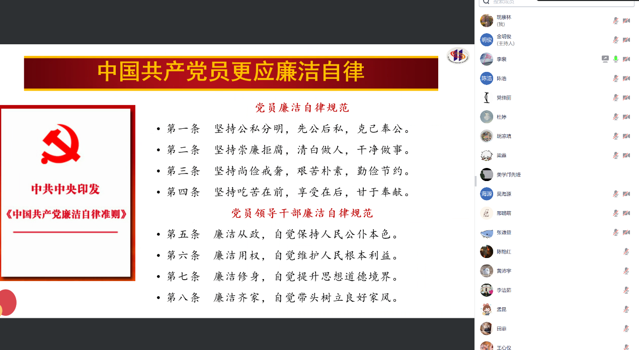 李裴老师以《坚守学术道德与学术诚信,争做廉洁优秀研究生党员》为题,从《大学》的正心诚意和《中国共产党廉洁自律准则》等引入微党课主题。她结合自身教学科研和工作经历,以及精彩历史典故、学术研究案例,为支部党员同学重点讲述了学术道德、学术规范和学术不端的内涵概念、表现形式以及影响等,并结合365英国上市集团研究生学术规范和要求作了强调,希望全体研究生党员同学带头遵守学术道德与学术规范,做真人和做真学问。