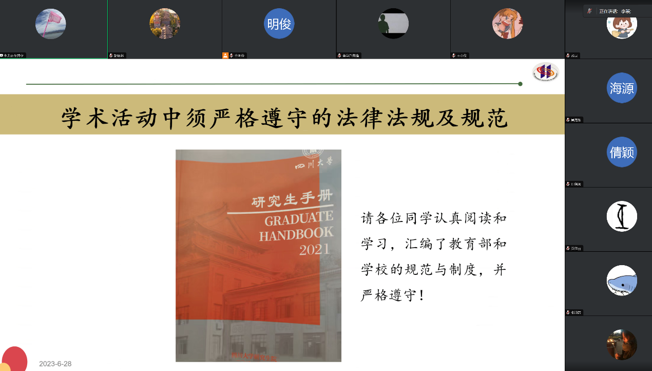 2023年6月28日晚上,哲学系与宗教所党总支学生四支部主题教育微党课通过在线会议的形式举行,哲学系副主任、道教与宗教文化研究所副所长李裴老师、党政办胡康林老师和学生四支部20余名党员参加,微党课活动由胡康林老师主持。