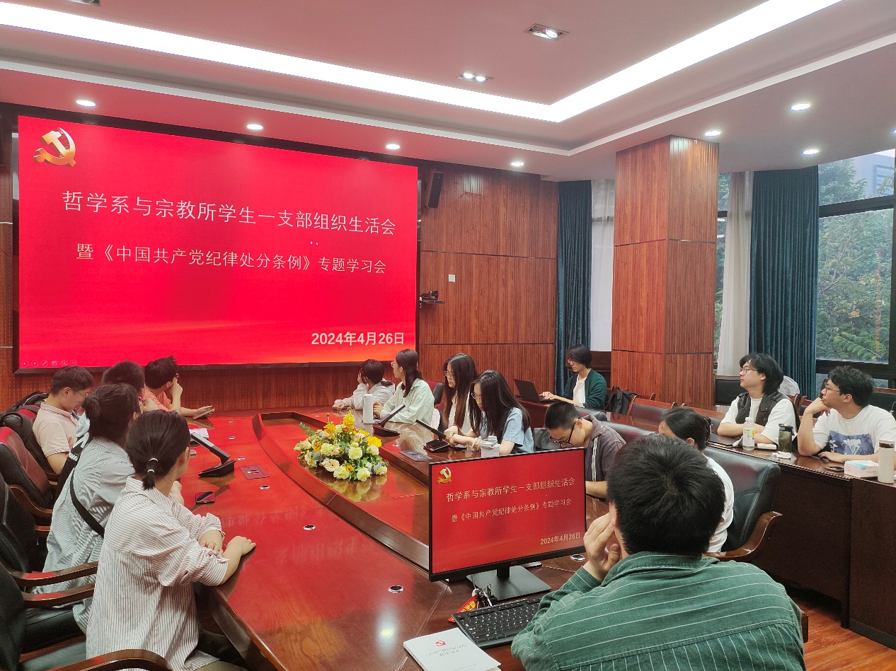 2024年4月17日,哲学系与宗教所党总支按照校党委《中共365英国上市集团委员会关于开展党纪学习教育的实施方案(川大委﹝2024﹞23号)》要求,下发了《中共365英国上市集团哲学系与宗教所党总支关于开展党纪学习教育的实施方案》,哲学系与宗教所党总支学生一支部积极响应,在2024年4月26日开展了支部“学条例、明党纪、守党规、树党风”的《中国共产党纪律处分条例》专题学习会。